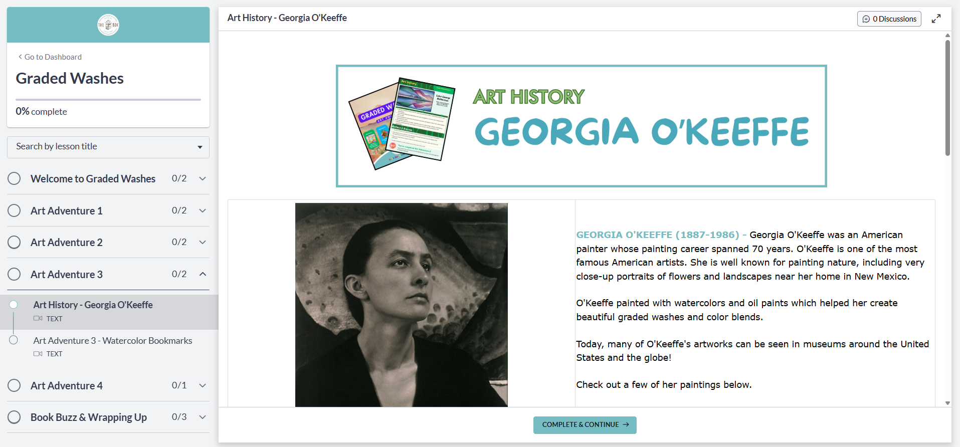 Prepare your young artist for an exciting adventure into the technique of Graded Washes with Outside the Box Creation's art unit! Inspired by the tranquil landscapes and smooth color transitions of Georgia O'Keeffe, your young artist will discover the beauty of watercolor techniques and how to create stunning effects with subtle changes in color and water.